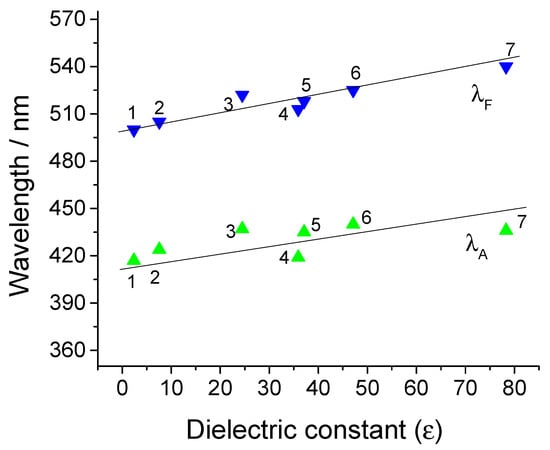 Dependence of absorption (green triangles) and fluorescence (blue triangles) maxima of NI-DAT on the dielectric constant: 1—Dioxane; 2—Tetrahydrofuran; 3—Ethanol; 4—Acetonitrile; 5—N,N-dimethylformamide; 6—Dimethyl sulfoxide; 7—Water.