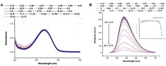 Influence of pH on (A) the absorption spectrum (B) the emission spectrum and on the emission at 535 nm (inset) of NI-DAT, (c = 10−5 M), λex. = 450 nm.