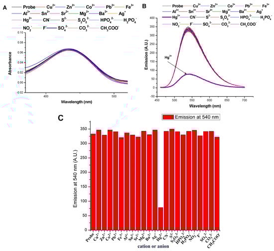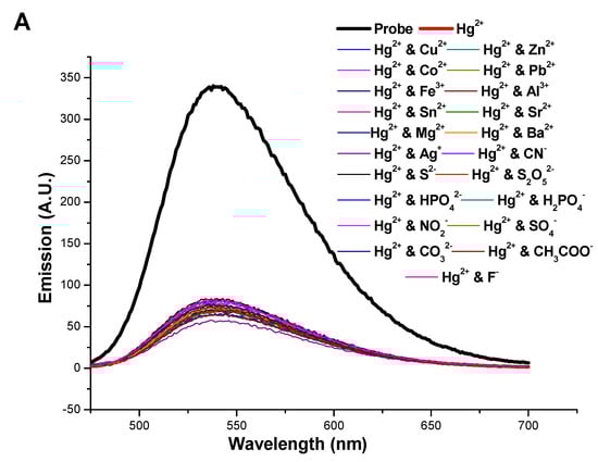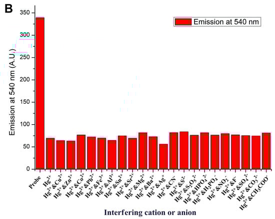 Furthermore, the selectivity of the new chemosensor to Hg2+ response has been examined by measuring the emission spectrum of the probe in the presence of 5 equivalents of both Hg2+ and the interfering cation or anion. As shown in Figure 7, the emission response of the probe toward the presence of Hg2+ was not affected by the coexistence of any of the interfering cations or anions under the study.