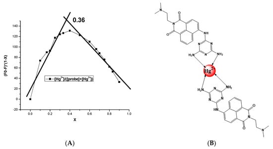 (A) Job’s plot and (B) suggested structure of probe/Hg2+ complex.