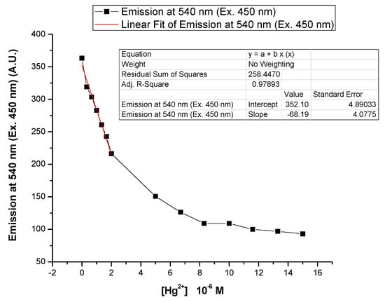 The sensitivity of NI-DAT to detect Hg2+ has been estimated from the titration plot of the emission at 540 nm against the concentration of Hg2+, shown in Figure 8, using the formula of the limit of detection (LOD) = 3σ/b, where σ is the slandered deviation of the emission of the probe recorded at 540 after repeating the measurements 10 times, and b is the slop of the titration plot. The found LOD was found to be 2 × 10−7 M.