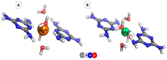 In addition, possible complexes formed as a result of the complexation of hexahydrated Mg2+ cations, [Mg(H2O)6]2+, with TAT model system were modeled. The positive value (11.9 kcal mol−1) for the Gibbs energy of the complex formation reaction with hydrated magnesium ions in water indicates non-spontaneous and energy-unfavorable complex formation processes. Magnesium ion coordinates six water molecules more strongly than mixed ligand (TAT)/water molecules. The results obtained for the complexation of hydrated Hg2+ and Mg2+ cations with a simplified NI-DAT model are consistent with the experimental data and outline a difference in the complexation behavior of metal cations from the ligand.
