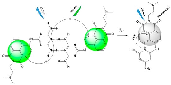 At lower pH, the inclusion of nitrogen atoms (imine nitrogen of triazine moiety) in the hydrogen bonding of the dimer assembly, shown in Figure 1, blocks PET to 1,8-naphthalimide and hence opens fluorescence emission like the related reported 1,8-naphthalimides analogs [77,78,79,80,81]. In contrast, the probe responds to higher pH by an on-off response due to the deprotonation of NH2 and concomitant switching of PET, Scheme 2.