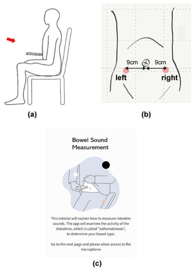 Bowel sound measurement positions. (a) Seated recording posture; (b) microphone placement over the lower right and left parts of the abdomen; (c) a smartphone screen showing the measurement instructions.
