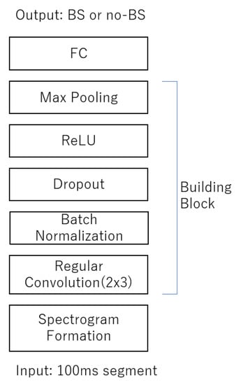 The 100 ms segment of spectrogram was fed to CNN building blocks where it consisted of two sets of three convolution layers, batch normalization, dropout, rectified linear unit (ReLU) activation function, max-pooling layer, and fully connected layer (FC).