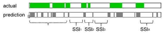 Sound to sound interval was calculated by the length between the end of the bowel sound and the start of the consecutive bowel sound. The green colored area in the top horizontal bar labeled “actual” shows the bowel sound length that have been manually labeled by human raters. The bottom one with gray colored area labeled “prediction” shows the bowel sound length that have been predicted by the models. The interval of the bowel sounds is used as an index called SSI.