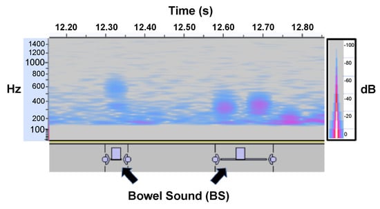 During general auscultation, BS intervals of 2–15 s/min are considered normal, with a decrease in this interval indicating an increase in peristalsis and an increase in this interval indicating a decrease or absence of peristalsis. The mean value of the BSs obtained in this study was small, which is enough to be diagnosed as increased peristalsis during general auscultation. This labeling was conducted using fragments (0.1 s) so small that it is difficult for a person to recognize them without spectrogram visualization; therefore, to establish the extent to which the calculated SSI is related to peristalsis, BS measurements by manometry and colonic transit tests should be performed in parallel, as seen in a previous study []. This formula would allow clinical-level gut diagnosis to be performed at home using a smartphone.
