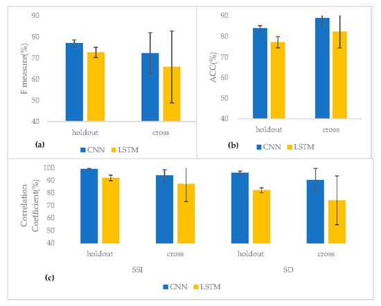 Two BS recognition models; CNN and LSTM are compared by using two evaluation methods; a holdout and a cross evaluation. (a) F measure results. (b) ACC results. (c) The correlation coefficient (%) for sound-to-sound interval (SSI) and sound duration (SD).