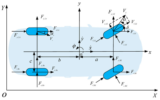 In this paper, we select three degrees of freedom in , directions and rotation around axes to establish a simplified three-degree-of-freedom dynamics model of the vehicle with four wheels. Figure 1 shows a bicycle model of a vehicle. The coordinate system denotes the geodesic coordinate system and the coordinate system denotes the vehicle coordinate system, both of which satisfy the right-handed spiral rule. The symbolic definitions of the physical quantities in dynamics are shown in Table 1.