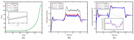 From Figure 2, which shows the comparison of simulation results with as the variable, it can be seen that when increases, the lateral error generated by the vehicle tracking the road centerline decreases accordingly, which is due to the fact that increasing makes the system more sensitive to the lateral error generated at each time step, and the vehicle will quickly correct the error when is generated. However, the larger the , the less obvious the reduction in . However, the increase in leads to the increase in lateral acceleration and the deterioration of stability.