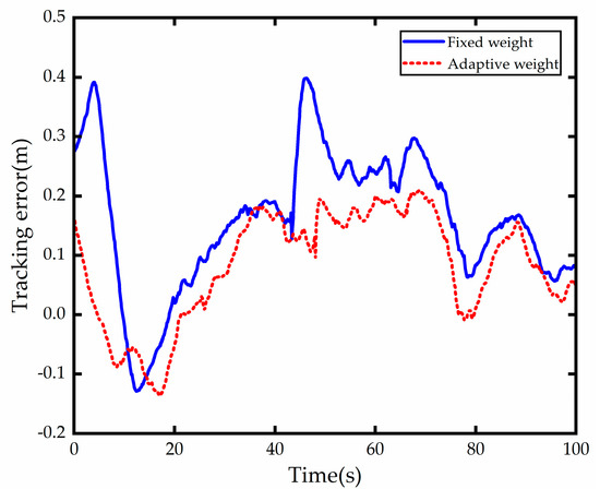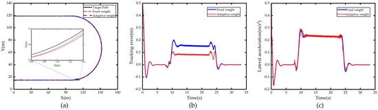 Figure 10d shows a comparison of the lateral acceleration of the vehicle, and it can be seen that both increase with the increase in road curvature. The lateral acceleration of the vehicle with the weight adaptive controller has a larger but roughly the same jitter compared to the lateral acceleration of the vehicle with the fixed weight controller, which is caused by the fact that the controller is more sensitive to errors after increasing .