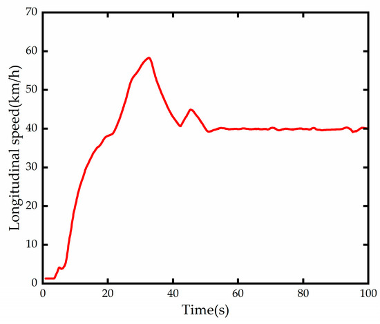 The curvature of the test road obtained from the forward-looking lane line detection module is shown in Figure 14, and it can be seen that the variable curvature road has two continuous reverse curves with a minimum curvature radius of about 500 m. The longitudinal speed variation diagram is shown in Figure 15, and the test platform takes some time to reach the expected speed due to the existence of factors such as automatic gear lift and power system lag, but it does not contradict the test verification content.