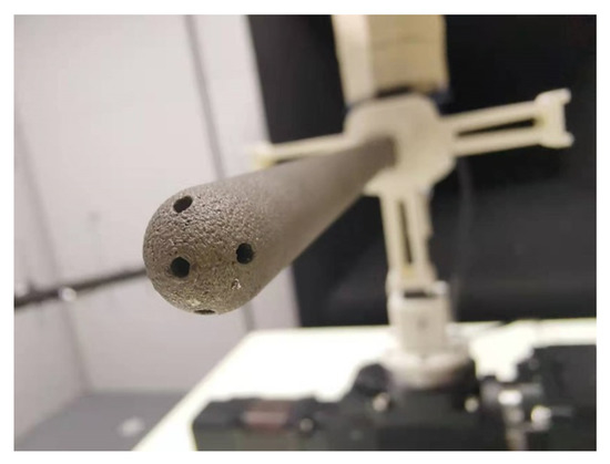 In consideration of cost, we designed the probe we used (Figure 2) in the experiment by referring to the existing five-hole probe (manufactured by VECTOFLOW GMBH in Germany), and then made it by 3D metal printing. The five pressure holes at the top can obtain pressure data at five points at fixed positions on the semi-circular sphere (except the pressure hole at the top, the pressure holes are evenly distributed, and these four holes have a cone angle of 55°). Meanwhile, static pressure information can be obtained through the static pressure holes on the side.