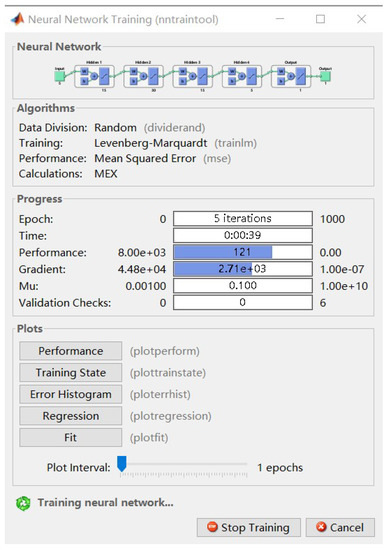 We used Neural Net Fitting App in MATLAB R2020b software to build and train the neural network. In order to ensure the training performance and efficiency, we selected the Levenberg–Marquardt algorithm as the training algorithm. After training, the required neural network can be obtained, and it can be imported into Simulink for subsequent verification and simulation. Partial images of this process are shown below (Figure 11 and Figure 12).