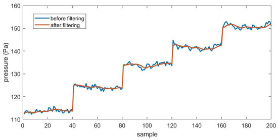 Although the turbulence degree of the wind tunnel is not high, the pressure data obtained from the probe have relatively large fluctuations because of the relatively low incoming flow velocity. In addition, the fluctuation of pressure data gradually intensifies as the angle of attack increases and with the separation of air flow. Theoretically, the pressure data of a certain combination of speed and angle should be fixed, so we can try to use the filtering method to process the data.