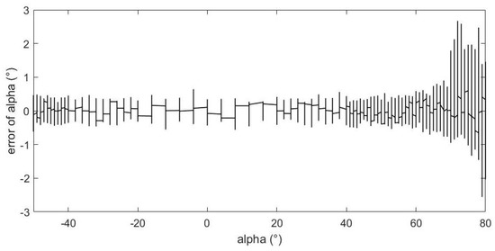 Figure 14 shows the relationship between the estimation error of angle of attack and the value of angle of attack. From the figure, we can see that as the absolute value of the angle of attack increases, the estimation error gradually increases, and there are relatively good estimation errors within ±60°. When the angle of attack exceeds 70°, the estimation error increases rapidly, but basically remains within ±3° when angle of attack is less than 80°.