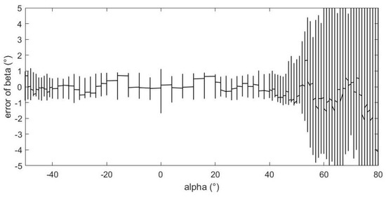 Figure 15 shows the relationship between the estimation error of sideslip angle and the value of angle of attack. From the figure, we can see that, as the absolute value of the angle of attack increases, the estimation error gradually increases, and there are relatively good estimation errors within ±50°. When the angle of attack exceeds 60°, the estimation error of sideslip angle will increase rapidly, even exceeding 10°.