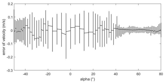 Figure 16 shows the relationship between the estimation error of the incoming flow velocity and the value of angle of attack. From the figure, we can see that as the absolute value of the angle of attack increases, the estimation error is basically unchanged and remains at a relatively small level. The reasons for this are that few velocity values were used in the experiment, and more importantly, there is a good and obvious relationship between pressure data and velocity. Therefore, the estimation of the magnitude of the velocity does not require much attention.