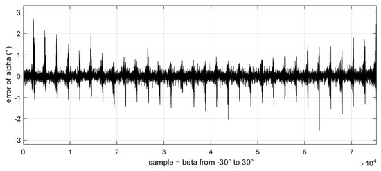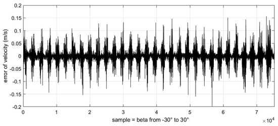 It should be noted that the abscissa of the following three images is the change in samples, which represents the uniform change in sideslip angle from −30° to 30° from left to right. We can see that the error displayed in these images always changes from small to large in a certain period. This phenomenon is because in our experimental data, each sideslip angle corresponds to a group of angles of attack varying from −50° to 80°. These images also verify the conclusion that the estimation error of the airflow parameters will increase gradually as the absolute value of the angle of attack increases.