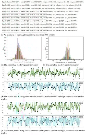 Both models have been trained for 1000 epochs to reach convergence. The simplified model’s loss stopped decreasing at around 250 whereas the complete model’s loss stopped decreasing at around 30. Figure 7a just shows an example of training the complete model. The training procedure of the simplified model is just similar. After training the two models, they have been evaluated with the testing datasets. As illustrated in Figure 7b,c, the prediction errors for both models satisfy the Gaussian distribution. Figure 7d–f demonstrate the scatter plots of using the complete model to predict the flexion/extension angles on hip, knee, and ankle, respectively. Again, the simplified model’s prediction results are just similar. So, they are not shown here. The results of the DNN models have further indicated that the upper and lower limb coordination can be revealed by the strong correlation existed between the selected vertical displacements and the selected joint angles [8,48].