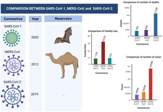 Middle East Respiratory Syndrome Coronavirus (MERS-CoV) is another virus that belongs to Coronaviridae family that caused a global burden in the year 2012. The virus was first identified in Saudi Arabia, and later spread to 27 countries, leading to approximately 2600 cases. The disease has infected thousands, and approximately 35% of patients died from the disease. Dromedary camels were linked with the transmission of the virus to human primates [32,33]. Figure 1 shows the differences and similarities between SARS-CoV-1, MERS-CoV-2, and SERS-CoV-2 in terms of number of cases, fatality rate, mortality rate, reservoir, etc.
