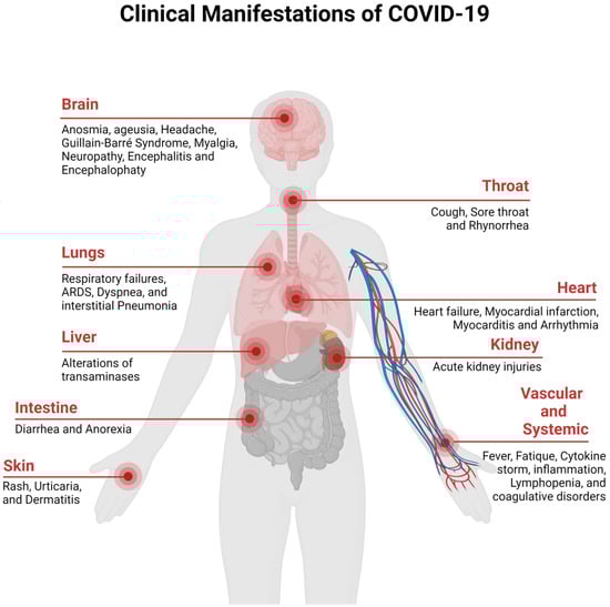 The clinical spectrum of the COVID-19 disease ranges from asymptomatic to severe acute respiratory disease and death. People infected with the disease display pneumonia symptoms, which include shortness of breath, sore throat, fever, fatigue, and cough. People that are at risk of COVID-19 include elderly people who are suffering from chronic diseases, such as chronic lung disease, cancer, hypertension, renal and kidney diseases, diabetes, cardiovascular diseases, etc. [35,36]. The clinical manifestations of SARS-CoV-2 are presented in Figure 2 (redesigned using Biorender [27]).