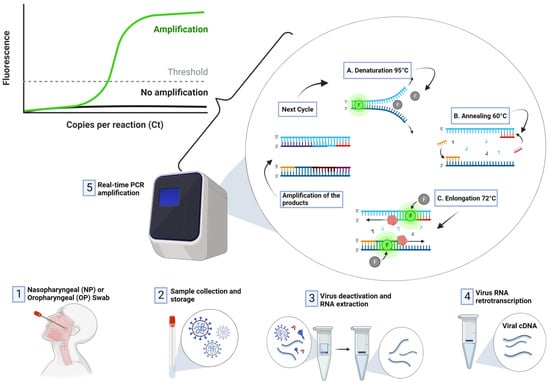 RT-PCR is regarded as the most reliable approach for the detection SARS-CoV-2 [5,41,42]. RT-PCR is a nuclear-derived approach for the detection of the genetic content of pathogens, such as viruses (such as Zika and Ebola) and bacteria. The early RT-PCR testing employ radioisotope markers which are subsequently replaced by fluorescent dyes. As shown in Figure 4, the procedure for conducting RT-PCR test follows four steps:
