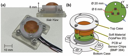 The soft material plays an important role in transmitting external stimuli and should be carefully considered to meet the requirements of the sensor specification. Therefore, we investigate the fundamental characteristics of single-cell BPSC-based sensors with different types of soft materials and thicknesses to set the sensor design parameters. Shown in Figure 2a, a total of nine samples are taken into consideration with different thicknesses (3, 5, and 8 mm) and different shore hardness (EcoFlex 00-20 (0.2), VytaFlex 20 (20A), and MoldStar 31T (30A), Smooth-On Inc., Dallas, TX, USA). For each sample, soft material is cast 20 × 20 mm on the PCB while the BPSC (BMP384, Bosch, Germany) is located at the center.