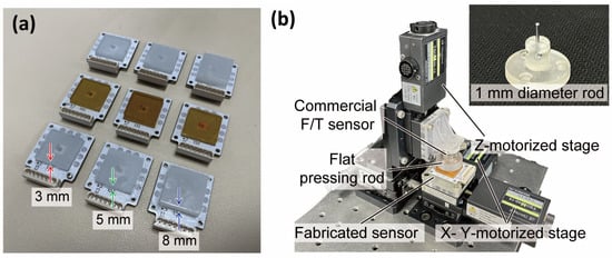 To characterize each sample to discover the maximum measurable force, linearity, and hysteresis ratio between the loading and unloading, an experimental bench is organized, as in Figure 2b. The Z-motorized stage presses the sensor with a commercial F/T sensor (Nano 17, ATI Industrial Automation, Apex, NC, USA), and X- Y-motorized stages move the sensor in the two-dimensional plane. A flat pressing rod presses the sensor until the single BPSC-based sensor reaches the maximum value.