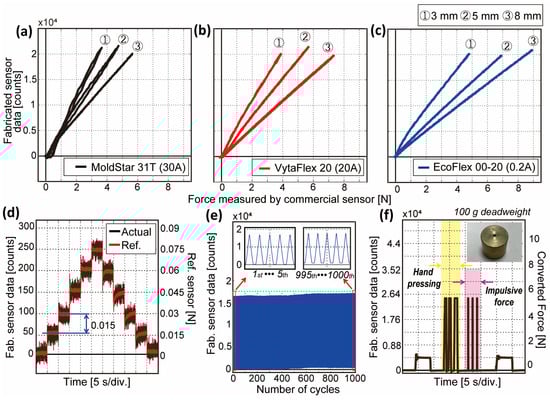 Experimental results of fundamental characteristics with different cast soft materials and thicknesses. (a–c) Experimental results of MoldStar 31T, VytaFlex 20, and EcoFlex 00-20, respectively, in force (N) to sensor data (counts). (d) Sensitivity for VytaFlex 8 mm. (e) Repeatability of VytaFlex 8 mm. (f) Robustness of single BPSC-based tactile sensor with excessive stimuli.