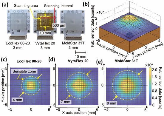 Experimental results of investigating sensible zone. (a) Picture of samples with scanning area and interval. (b) Sensing result in 3D of VytaFlex sample, showing sensing point close to the sensing hole reacts sensitively. (c−e) Sensing results in 2D where bigger shore hardness material has a wider sensible zone.