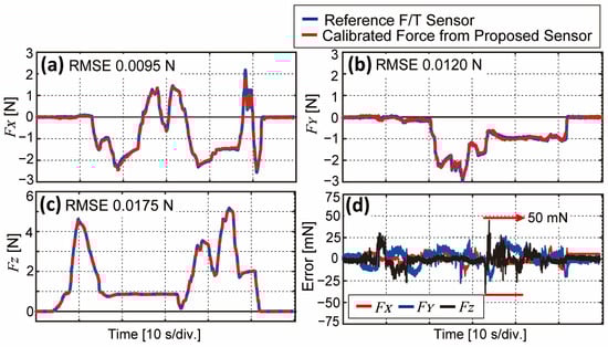 (a–c) Results of the calibrated forces in X-, Y-, and Z-axis, respectively, with RMSE. Blue solid lines indicate reference force, and red dashed lines indicate calibrated force. (d) Force error in three-axis, which is smaller than 50 mN in all three axes.