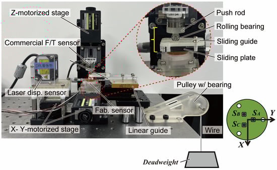 To validate two main factors for detecting slip from DWT, which are (1) slip detectable level of DWT and (2) decoupling ability from normal and shear forces, we compose another experimental bench with deadweights, as shown in Figure 7. In addition to the previous bench, a laser displacement sensor (ZX2-LD50, OMRON, Kyoto, Japan) works as another reference sensor for slip detection ground truth. In order to minimize the frictional effect of the push rod while slipping, a rolling bearing is installed at the commercial F/T sensor, as can be seen in the close-up picture in Figure 7. The bearing rolls down the sliding guide with a rail when a slip happens. An acrylic sliding plate is in contact with the sensor surface, sliding along the linear guide as deadweight pulls the plate in the Y-direction. Here, three different deadweights (50, 100, and 200 g) are hung on the wire. For the experimental protocol, we conduct two different experiments with this bench, which are (1) level of DWT, which properly decouples slip, and (2) decoupling ability of shear force and slip.