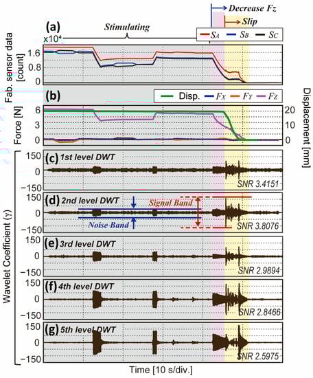 Experimental results of slip detection in different DWT levels. Red area indicates stimulating period with random three-axis forces and yellow area indicates slip. (a) Fabricated sensor data from each BPSC. (b) Three-axis forces and displacement from reference sensor. (c–g) DWT results in the 1st to 5th level with SNR value.