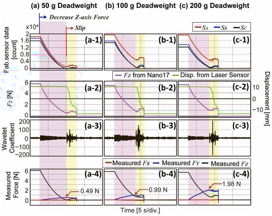 Experimental results of decoupling slip from Y-axis force. (a–c) Results with different deadweights (50, 100, 200 g). (a1,b1,c1) Fabricated sensor data from each BPSC. (a2,b2,c2) Z-axis force and displacement from reference sensors. (a3,b3,c3) DWT results in the time domain. (a4,b4,c4) Measured force calculated from fabricated sensor data. Measured indicates weight of deadweight.