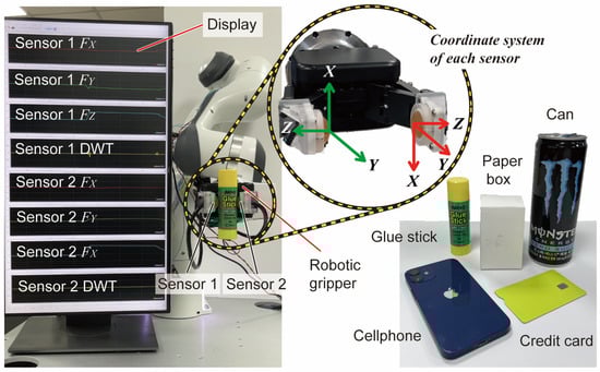 Experimental setup for practical applicability with common objects. Real-time plotting on the display of two sensors including three-axis forces and DWT result. Coordinate system of each sensor when installed on robotic gripper.