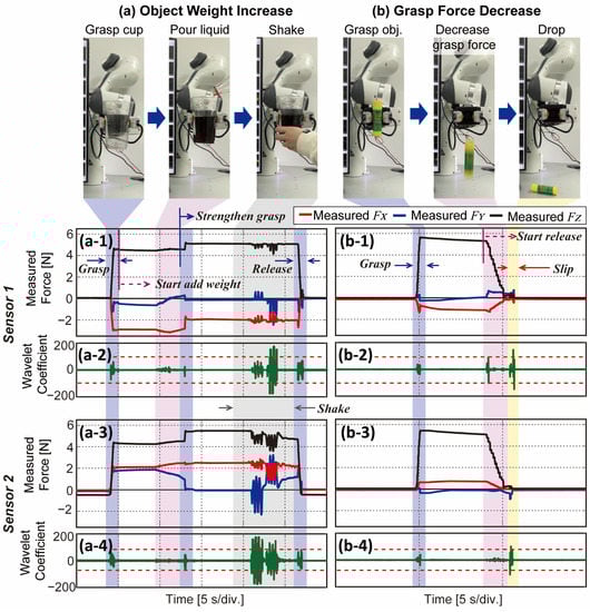 The sequence of this session and corresponding results are shown in Figure 11a. As can be seen in Figure 11(a1,a3), the (indicated in red lines) changes after starting to add weight around 10 s (red area). The gripper strengthens grasp force around 13 s as the (black lines) increases in both sensors. From the period when the increase, there is no more change in shear force, which can imply that the cup is stably grasped. The gray area indicates the section where the person grasps the cup and shakes to check the grasped state. Figure 11(a2,a4) show DWT results and set thresholds from sensor 1 and sensor 2, respectively. Except for the shaking phase, coefficients did not exceed the threshold (green lines), which means there was no slip during the pouring phase (Video S2). Because the contact between the sensors and grasped object cannot be perfectly aligned as a person gives the object, the magnitude of may vary in the two sensors. Moreover, the grasped object has attracting force downward by gravity, vary in big magnitude in both sensors—negative in sensor 1, positive in sensor 2 (red lines). The amplitude of variance in is smaller than but still varies. This is possibly due to the misalignment of the grasped object, and they are set to zero after the grasp force is strengthened (blue lines). Due to the misalignment, the gripper operates when either of the sensors exceeds the threshold. This experiment shows the ability of the sensor to provide the state information of unstably grasped objects by observing shear force in real-time and the gripper to react accordingly.