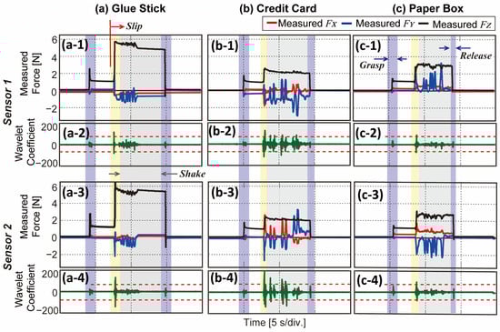 Shown in Figure 12 are the results with three different objects. Three-axis force from sensor 1 is indicated in Figure 12(a1,b1,a1), and from sensor 2 is indicated in Figure 12(a3,b3,c3). The DWT results from each sensor are plotted in Figure 12(a2,b2,c2) for sensor 1, Figure 12(a4,b4,c4) for sensor 2 (green lines). After grasping the object with a normal force of 1 N (black lines), an external interfering force is applied around 8 s (yellow area). At this moment (8 s), both sensors show significant peaks in DWT results. According to the sensors’ DWT result, the gripper strengthens its grasp force immediately to prevent the object from dropping as the (black line) increases suddenly. It can be noticed that the increased amount of the of inflexible objects (i.e., glue stick, cellphone) is bigger than flexible objects (i.e., paper box, credit card). A person checks the grasped state by shaking and finally releases the object. All objects were stably grasped after strengthening the grasp force, as in Video S3.