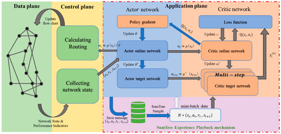 Although the TD3 algorithm alleviates the overestimation problem, it may lead to significant underestimation bias and affect the convergence performance when using the minimum approach for value interception. TD3 still suffers from slow convergence and instability, seriously affecting the network QoS. Pan et al. [35] used the Boltzmann softmax operator to estimate the value function to solve the problem of underestimation of TD3. However, this method increases the complexity of the TD3 algorithm and requires more computing resources. Huang et al. in [36] used a Graph Convolutional Network (GCN) to optimize DRL networks. Wang et al. [37] proposed a reinforcement learning-based relay Graph Neural Network (GNN). The model combining GNN and RL performs better in specific network scenarios. However, it must simultaneously optimize both networks’ parameters, requiring a longer training time. Meng et al. [38] proposed a mixed multistep DDPG approach (MMDDPG) and empirically demonstrated that the multistep approach can effectively mitigate the overestimation problem in DRL. Inspired by this strategy, we propose an improving DDPG algorithm using multi-step method and prior experience sampling to optimize the QoS performance of SDN. It enhances the algorithm’s stability by estimating the target Q-value update network after n steps and improves the algorithm’s convergence rate by extracting samples with a more influential temporal-difference error (TD error), thus solving the problems of unstable network performance and poor quality of service.