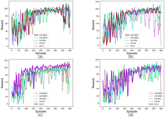 Figure 3 shows that the optimal actor learning rate varies with traffic intensity. Under high traffic intensities (100% and 75%), the reward curve is the best when the actor learning rate is 0.0001, as shown in Figure 3a,b. The reward curve is the best when the actor learning rate is 0.1 at low traffic intensities (50% and 25%), as shown in Figure 3c,d. In a high traffic intensity environment, because the link easily reaches the saturation state, the routing algorithm needs to adjust the link weight value more frequently. The reward is more stable after convergence at a lower actor learning rate. Based on the above results, the actor-learning rate of AQMDRL is set to 0.1, 0.1, 0.0001, and 0.0001 when the traffic intensity is 25%, 50%, 75%, and 100%, respectively. In low traffic intensity, the remaining bandwidth of the network link is sufficient, and the agent can speed up the optimal reward value exploration through a higher learning rate. However, in high traffic intensity, the agent needs a lower learning rate to explore the optimal reward value.