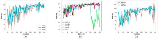 In Figure 4a, although the 8-step option reaches convergence first, the convergence value is lower, and the computational cost is higher for the 8-step compared to the 4-step option; therefore, we choose 4 as the number of steps. In Figure 4b, the reward curve is the best when the critic learning rate is 0.0003 because when the learning rate is too small or too large, the learning of AQMDRL is relatively unstable, which leads to the inability to obtain the optimal policy in a short time. In Figure 4c, the reward curve is the best when the replay buffer is 50.