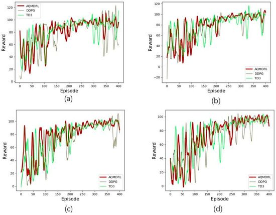 Figure 6 shows that each module of AQMDRL is crucial. SumTree-DDPG eliminates the multistep module of AQMDRL, and the convergence performance of the agent worsens. The MDDPG algorithm eliminates the SumTree-based prioritized experience playback of AQMDRL. Although it mitigates the overestimation problem of DDPG, its convergence rate is slow. The performance pf DDPG is the worst among all algorithms, with a slow convergence rate in the early stage and more jumps in the late stage. This is because DDPG blindly selects the action with the largest Q-value when selecting the action, which makes the algorithm itself have an overestimation problem. The experimental results show that our proposed AQMDRL algorithm uses a multistep method to mitigate the overestimation and underestimation of DDPG and improve the stability of agent convergence, while adding the SumTree-based priority caching mechanism to improve the convergence rate of DDPG.