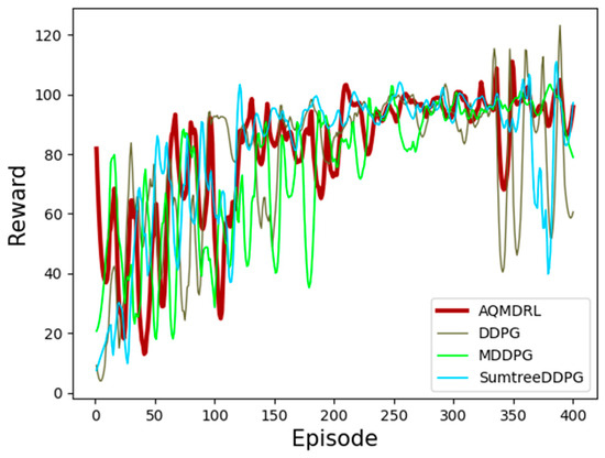 Finally, we analyze the calculation cost of the AQMDRL, TD3 and DDPG algorithms. In terms of the neural network calculation cost, both the AQMDRL and DDPG algorithms use one online network and one target network to train a mini-batch of samples, whereas TD3 requires two online networks and two target networks. Therefore, the calculation cost of TD3 is higher than that of AQMDRL and DDPG. In addition, compared with DDPG and TD3, AQMDRL increases the calculation cost of SumTree-based priority sampling , where is the size of the replay buffer. In summary, the calculation cost of AQMDRL is higher than that of DDPG and lower than that of TD3. Meanwhile, AQMDRL has a better convergence rate and performance than DDPG and TD3.