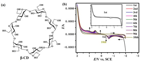(a) The chemical structure of β-CD; (b) multicycle CV curves of β-CD (6 mM in phosphate buffer solution, pH = 6.80) on GCE with potential from −2.0 to 2.0 V, scan rate of 100 mV/s and 10 cycles. Inset: the first CV curve of β-CD on GCE.