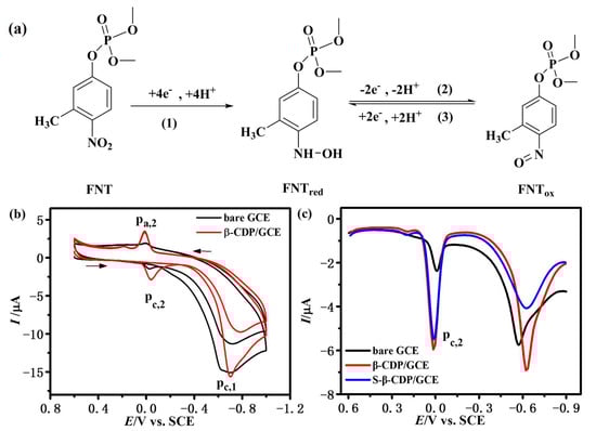 The chemical structure of FNT is shown in Figure 2a; it contains an electro-active nitro (–NO2) group. Its electrochemical behavior and the first two CV curves are shown in Figure 2a,b. During the first cycle, a reduction peak appears at about −0.6 V (pc,1), which is attributed to the reduction of –NO2 into hydroxylamine (–NHOH), resulting in the formation of FNTred, as shown in reaction (1). Then an oxidation peak at about 0.01 V (pa,2) occurs, which belongs to the oxidation of –NHOH of FNTred into nitroso (–NO), forming FNTox, as presented in reaction (2). In the second cycle, a new reduction peak at about −0.03 V (pc,2) is observed, which is caused by the reduction of –NO of FNTred into –NHOH, as shown in reaction (3). Reaction (2) and (3) are reversible. These results are consistent with the literature [30]. The peak currents of pc,1, pa,2, and pc,2 (Ipc,1, Ipa,2, and Ipc,2, respectively) are proportional to the concentration of FNT, which could be used for the quantitative analysis of FNT. The electrochemical response of FNT on β-CDP/GCE is similar to GCE, but the current has a great enhancement. However, the electrochemical behavior of β-CDP itself interferes with the Ipc,1 and Ipa,2 of FNT; thus we choose Ipc,2 for the quantitative analysis. The effect of scan rate on the Ipc,2 at β-CDP/GCE is shown in Figure S3. The Ipc,2 varies linearly with the scan rates from 10 to 300 mV/s, which indicates a typical adsorption-controlled process [27].