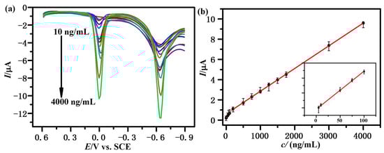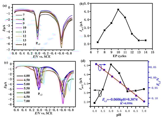 The influence of the pH value of the buffer solution was also investigated, as illustrated in Figure 3c,d. The Ipc,2 rises as the pH value increases, then reaches a highest value at pH = 5.00, but reduces after 5.00. Consequently, pH = 5.00 was chosen for electrochemical measurements, which is well consistent with other reports in the literature [31].