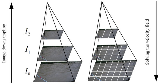 Although variable spectral flow is a computer vision method with good tracking and reproduction for small-scale displacements, its derivation about time and the spatial gradient does not satisfy the approximation relationship when there are large-scale displacements between the front and back images. To solve this problem, the multi-scale image pyramid algorithm is usually used. The Algorithm 1 itself is structured by a series of low-pass filters that allow the image to successively reduce its resolution by quadratic sampling, followed by solving the updated velocity field from coarse to fine, as in Figure 1.