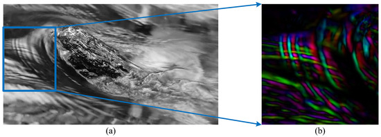 Turbulence image and its locally scaled HSV optical flow diagram: (a) turbulence image and (b) locally scaled HSV optical flow diagram of turbulence image.