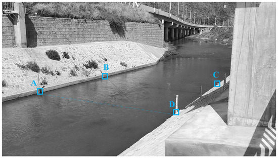 The arrangement of ground calibration points of the open channel is shown in Figure 5. Two points, A and B, were arranged on the left bank, and two other points, D and C, were arranged on the right bank, with the starting point coinciding with point D and the ending point coinciding with point A. Line DA was used as the cross-section line. The flow velocity meter measurement results are shown in Table 1.
