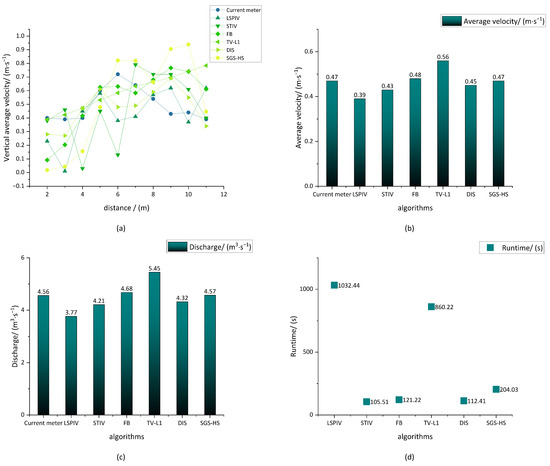 Comparison of experimental results: (a) vertical average velocity; (b) average velocity; (c) discharge; (d) time consumption.